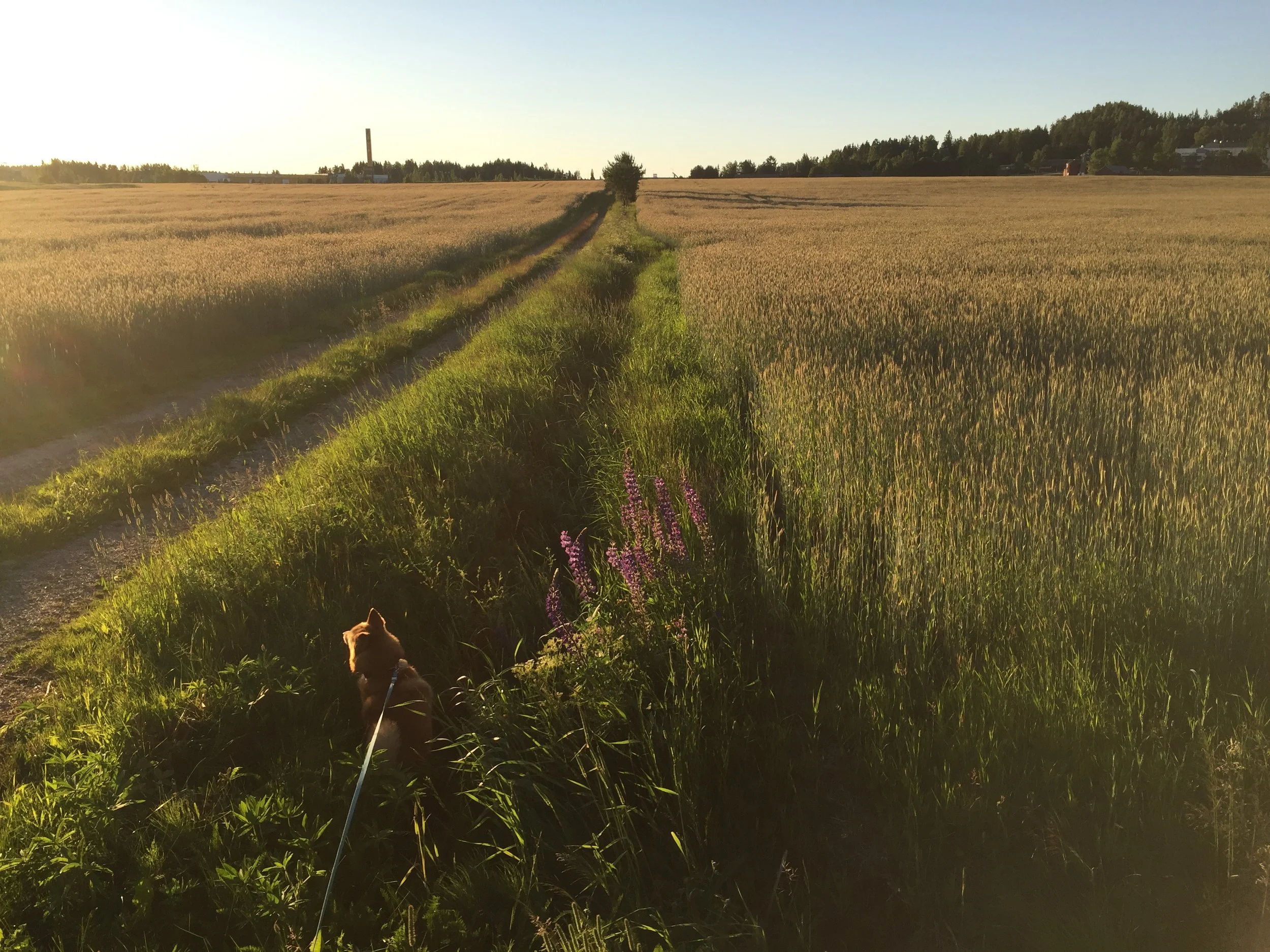 Edesmennyt Netta-koira tarkastelee ojan syvyyttä iltalenkillä omissa peltomaisemissa.